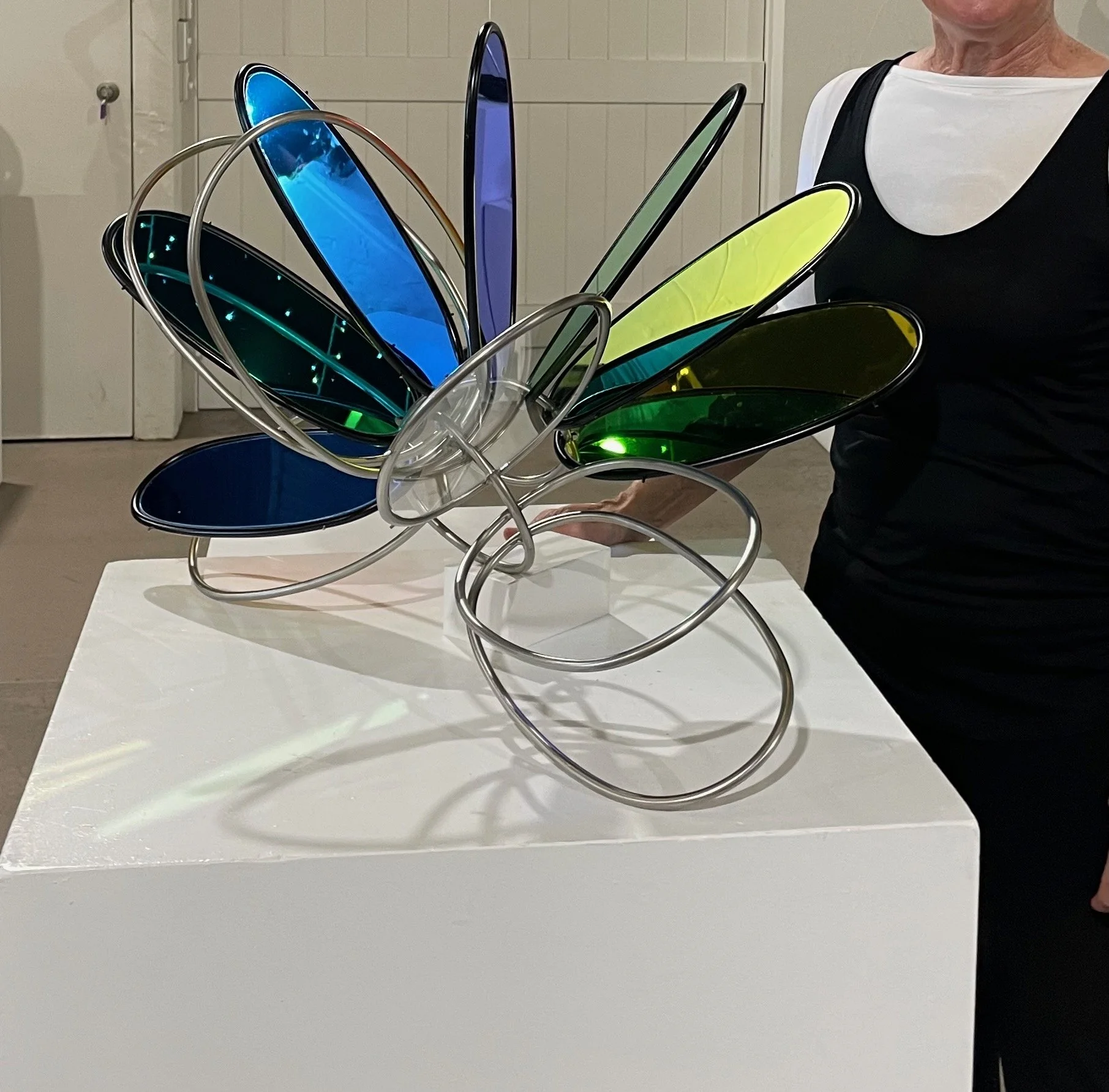 Fluidifying… rotating eight ellipses around the internal boundary curve, small sculptures, 2023-2024, acrylic sheet, iridescent foil, 925 silver, acrylic paint, pearlescent pigment, 200 x 200 x 100mm,. In and out of time... I am a unity and a multiplicity, exhibition, part of Radiant Pavilion, Melbourne Contemporary Jewellery and Object Biennial 2024.
