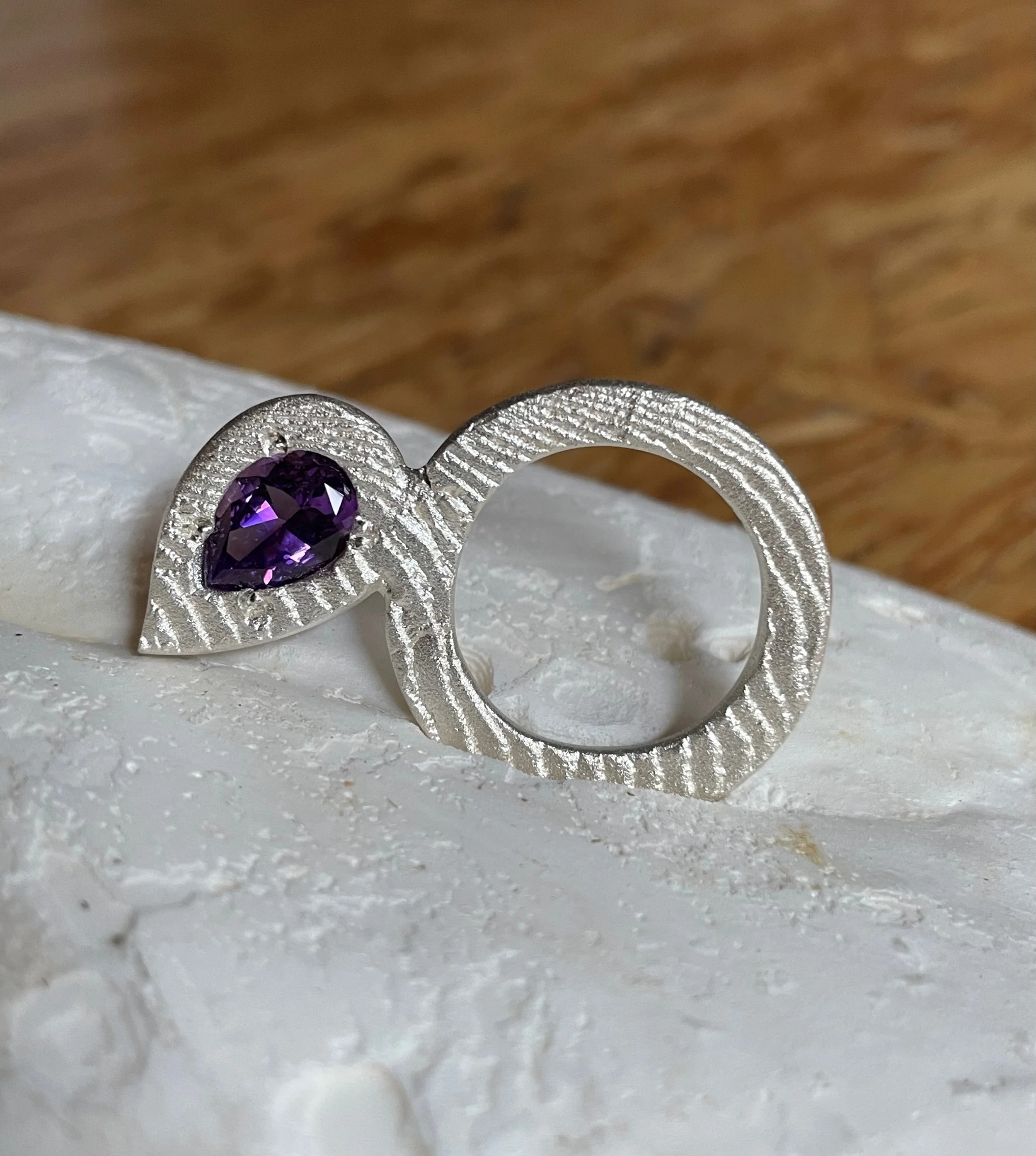 Helen Dilkes, Cuttlefish purple Mt Phillips WA amethyst ring, stone 1.67 carat 9.5 x 7mm, 925 silver, 38 x 24 x 4mm. Photograph: courtesy the artist